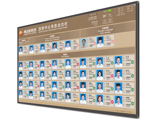 导游动态栏作为5A级景区的标配,传统纸质导游动态栏存在更新不便和观感差;印刷成本高、易造成资源浪费、环境污染,不符合绿色环保景区建设。横店影视城率先在广州街、香港街、明清宫苑、秦王宫、清明上河图、圆明新园和游客中心等景区,安装电子式景区导游动态栏,方便游客直观选择导游,管理层可随时了解各景区的导游情况。电子式导游动态公示栏启用以来为景区提供了卓越的导游服务体验。