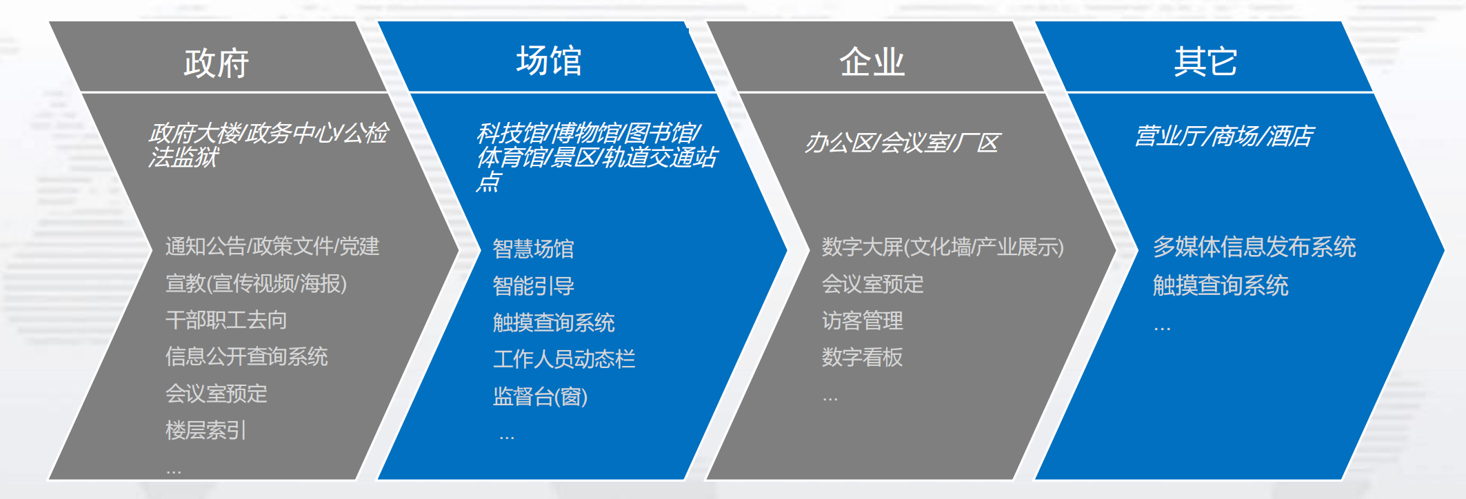 可通过一套平台管理所有的显示设备,如拼接大屏、智能电视、查询设备,设备系统支持Windows和Android。