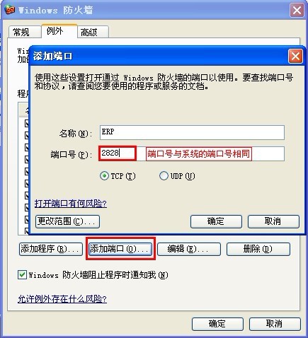 2. 双击Windows防火墙图标后,选中例外选项卡,再点击添加端口录入名称(不受限制)和端口号如下图: