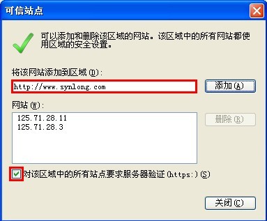 选择可信站点后单击【站点】,在将“该网站添加到区域(D)”下的文本框中输入西朗ERP/S3系统的访问地址后单击【添加】(提示:如果在添加过程中出现提示“添加到该区域中站点必须使用前缀 https://,该前缀能确保连接的安全性。”时,请取消“对该区域中的所有站点要求服务器验证(https:)(S)”前面勾选)。