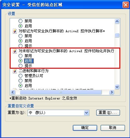 点击【自定义级别】弹出受信站点的安全设置,对未标记为可安全执行脚本的ActibeX控件初始化并执行脚本按下图进行设置。